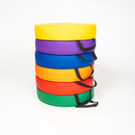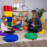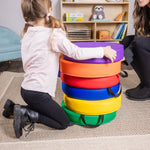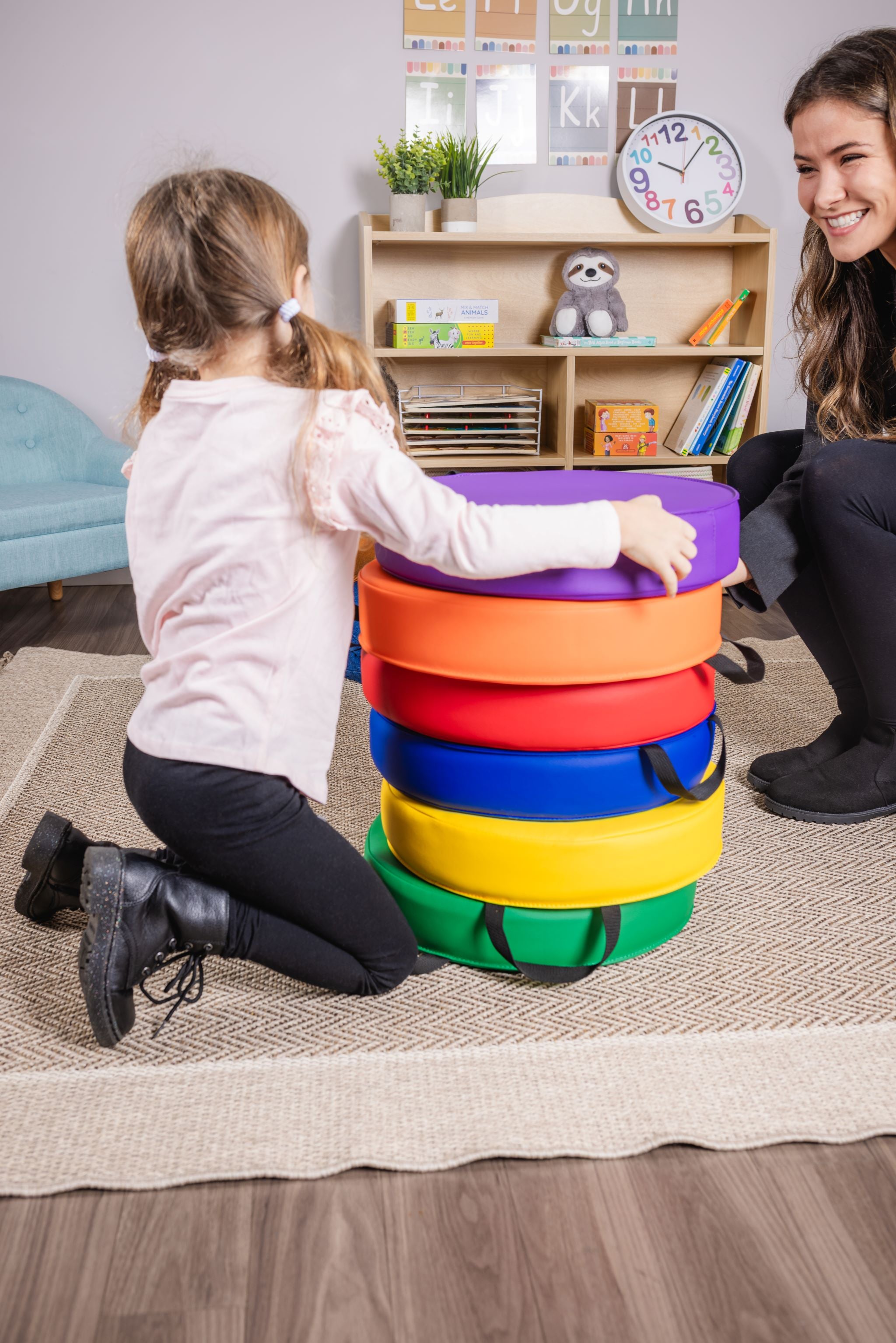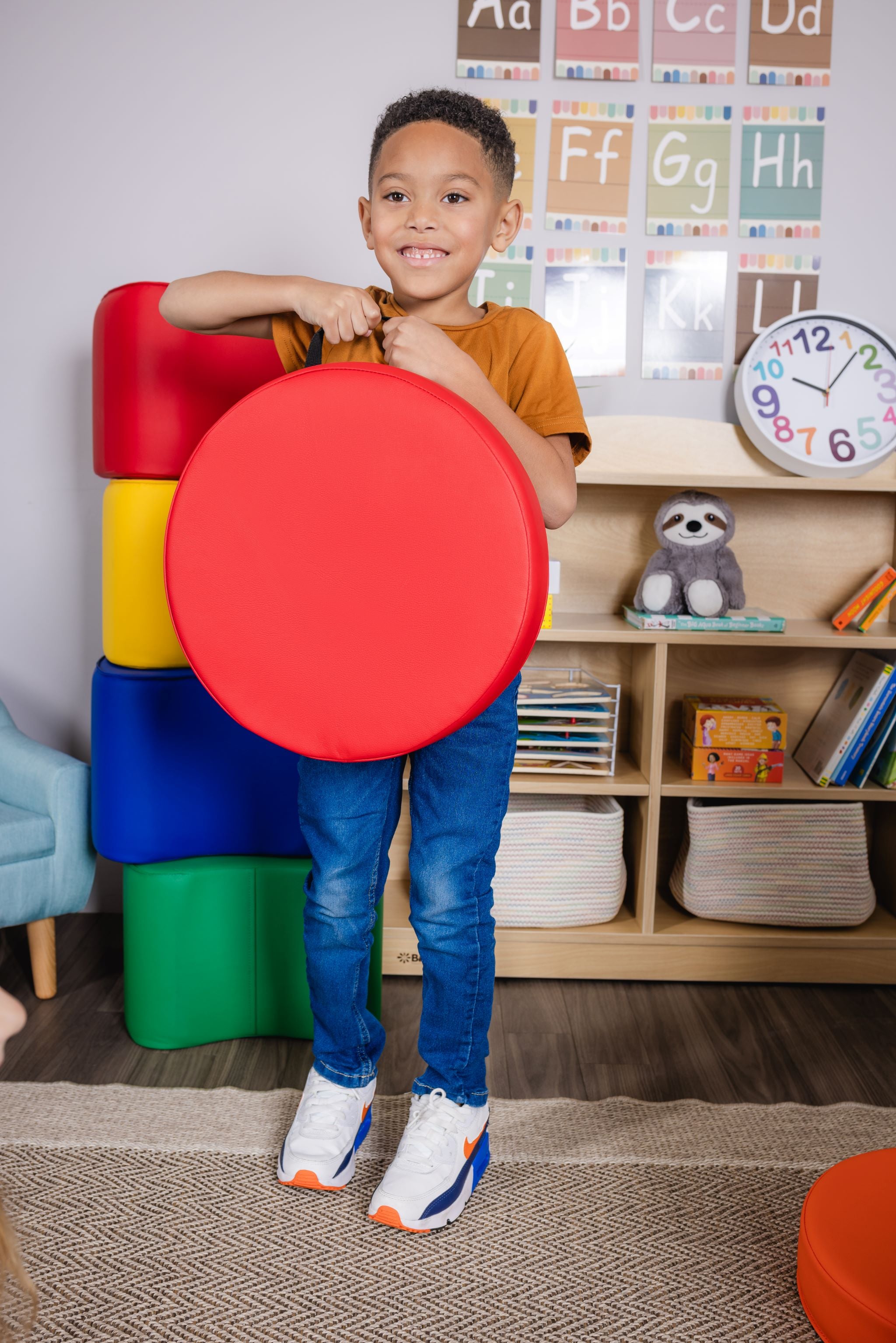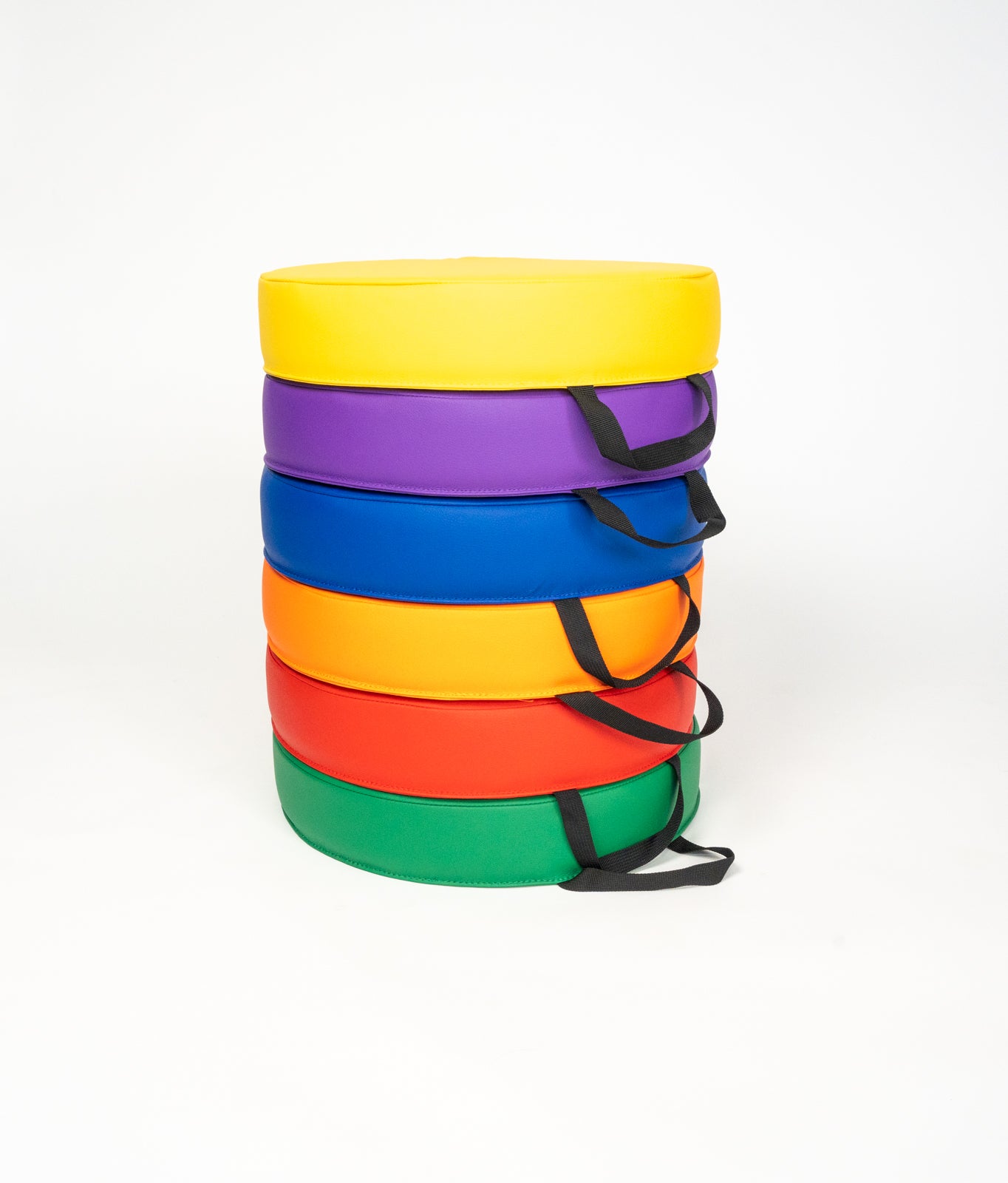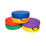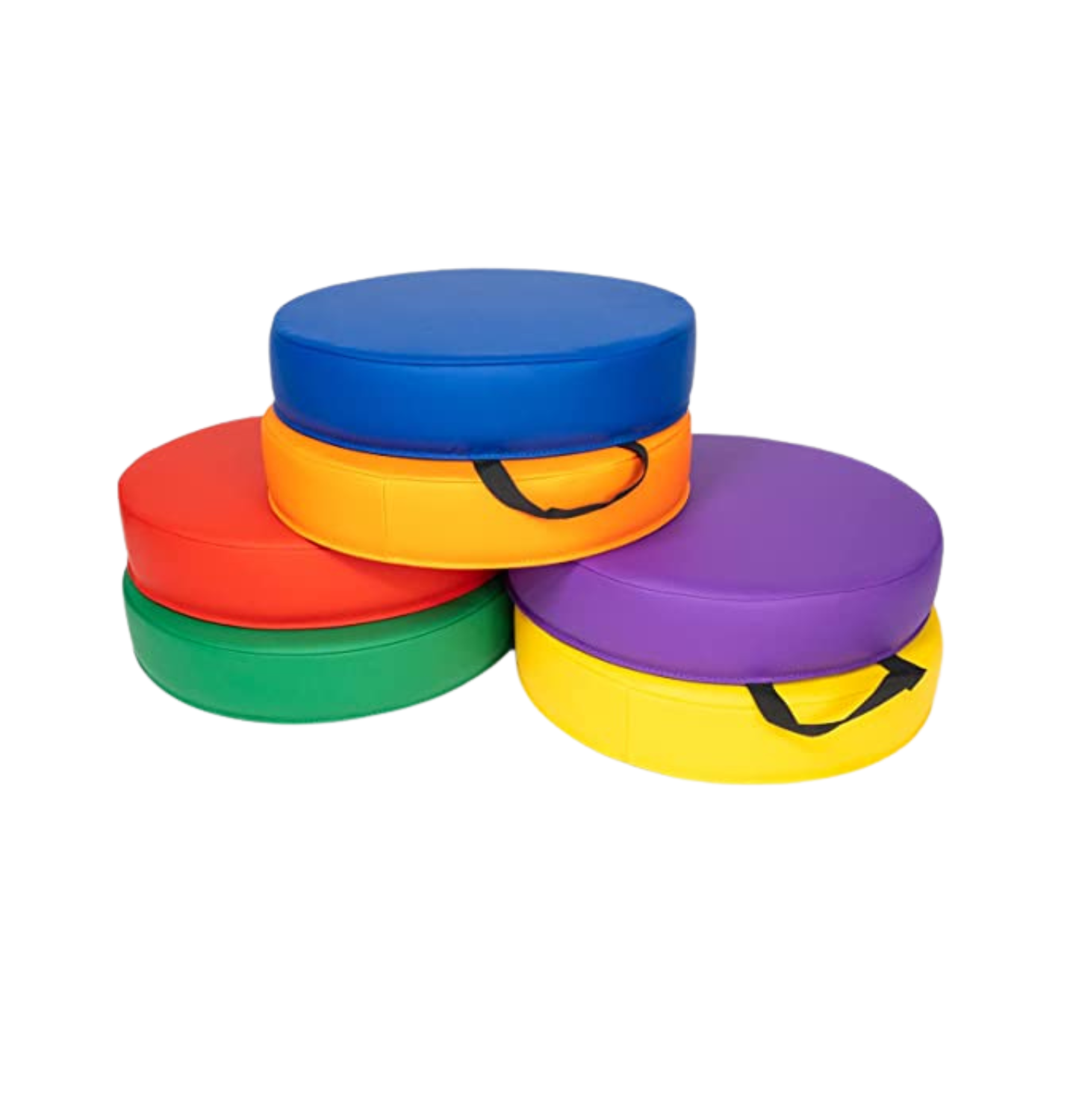 Spot markers help children recognize where it is appropriate for them to sit. The fun, color coded, cushioned markers encourage the children to stay seated, while letting them fidget, and shift, on the cushion. The cushions are versatile and can be used as stepping stones to help develop hand-eye coordination, balance, sensory processing, and body awareness. The markers are durable, and washable, making them very practical for home, and school use.the built in handle makes transporting them easy for young students.