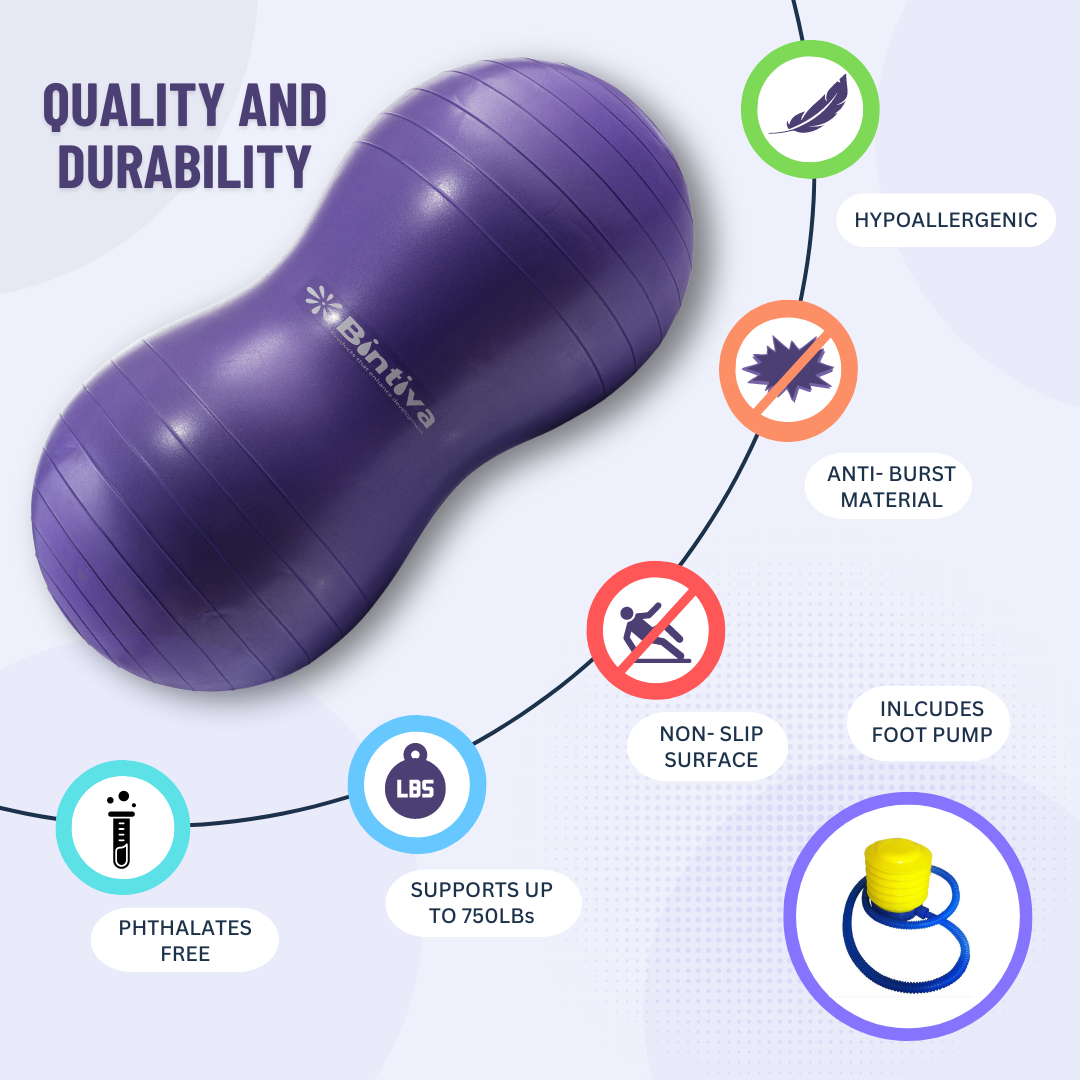 Our peanut ball is crafted from professional grade anti-burst material, and is similar to a standard stability ball. The difference being, that, peanut balls only move back and forth in one direction, versus the stability ball that is multidirectional. This provides more stability and control, and makes it ideal for therapy and rehabilitation use with children or seniors. The unique shape is also favored by midwives, and doulas, for use as a birthing ball.