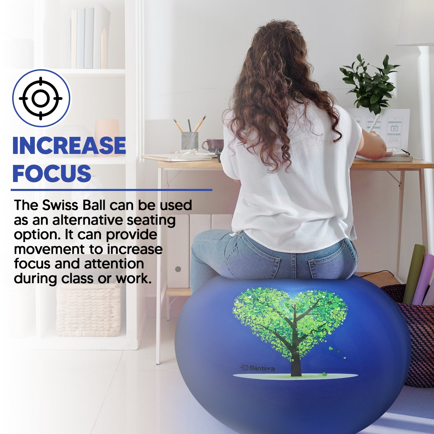 • INCREASE FOCUS – The Swiss Ball can be used as an alternative seating option. It can provide movement to increase focus and attention during class or work.