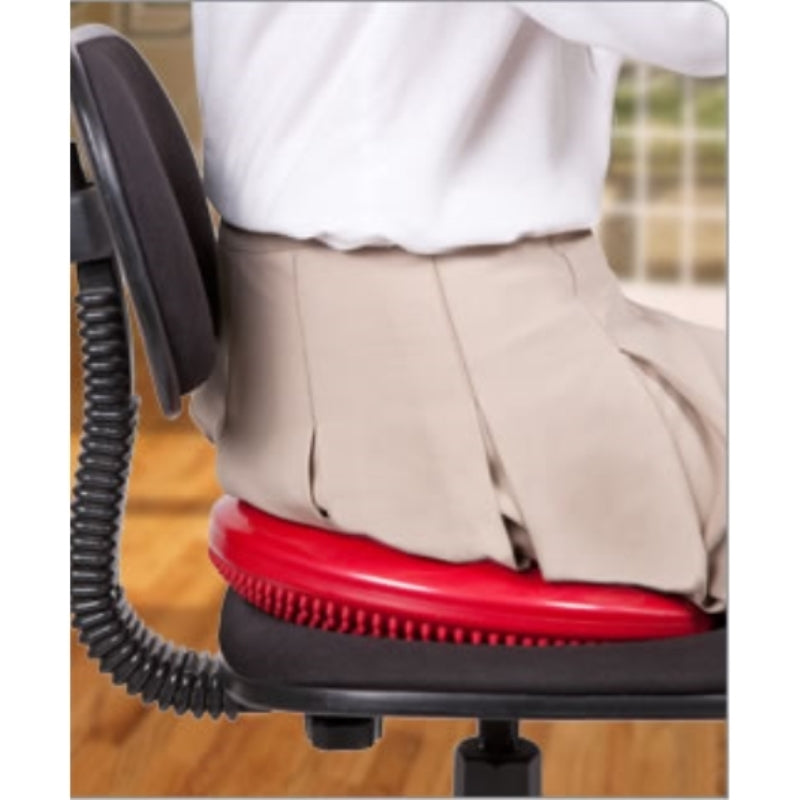 The disc can also be used as a textured seat cushion for children that have trouble sitting still. The disc allows them to wiggle and move around while staying seated. Educators and parents alike report great success using them to help calm children who have a hard time sitting still; they have recognized that, for many restless children, these "wiggly" seat cushions have a calming effect.